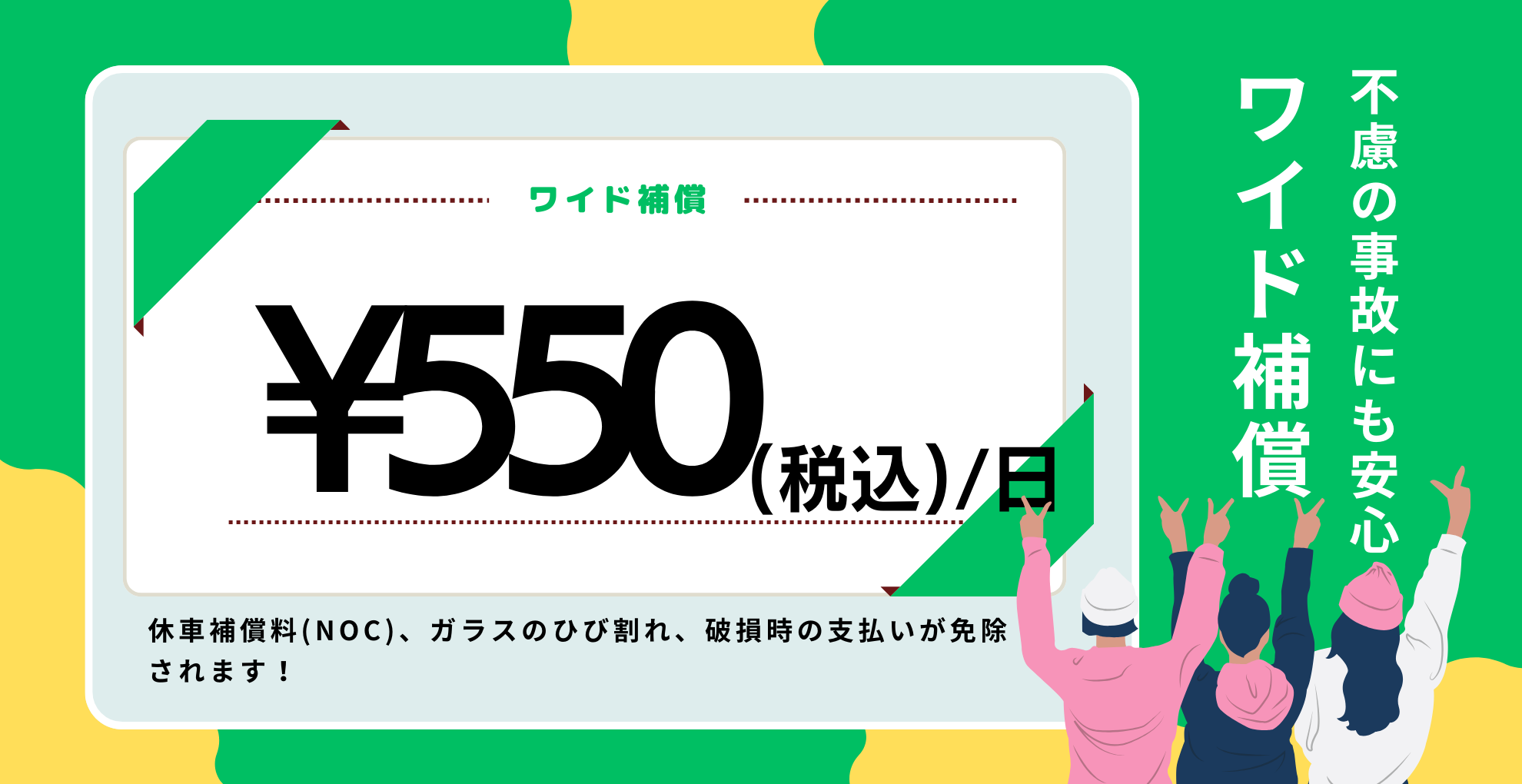 当社は免責補償制度に加えて、ワイド免責補償に加入していただくことで、ご利用中に車両に損害を与えた場合に、お客様のご自身の負担とってします、ノンオペレーションチャージの支払いを免除されます。
