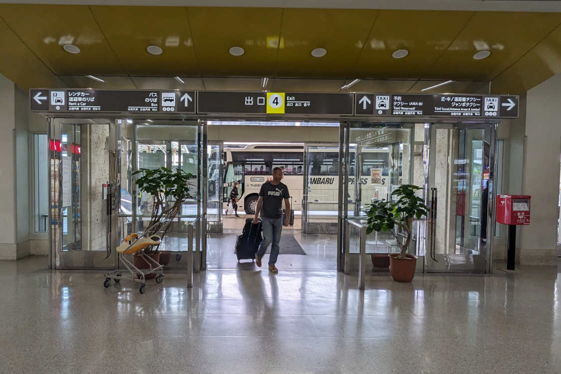 那覇空港に到着後、預け荷物をお取り頂き、到着口を出ていただき、1F 国内線エリアの到着出口4番ゲートを出て頂きます。