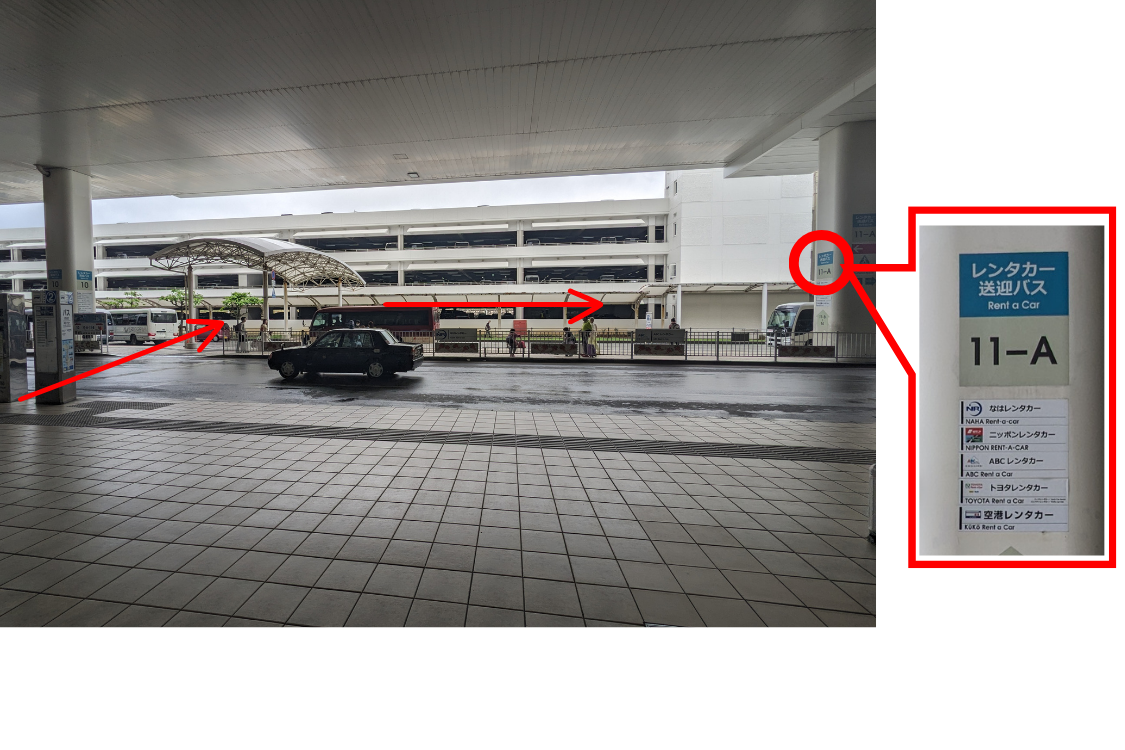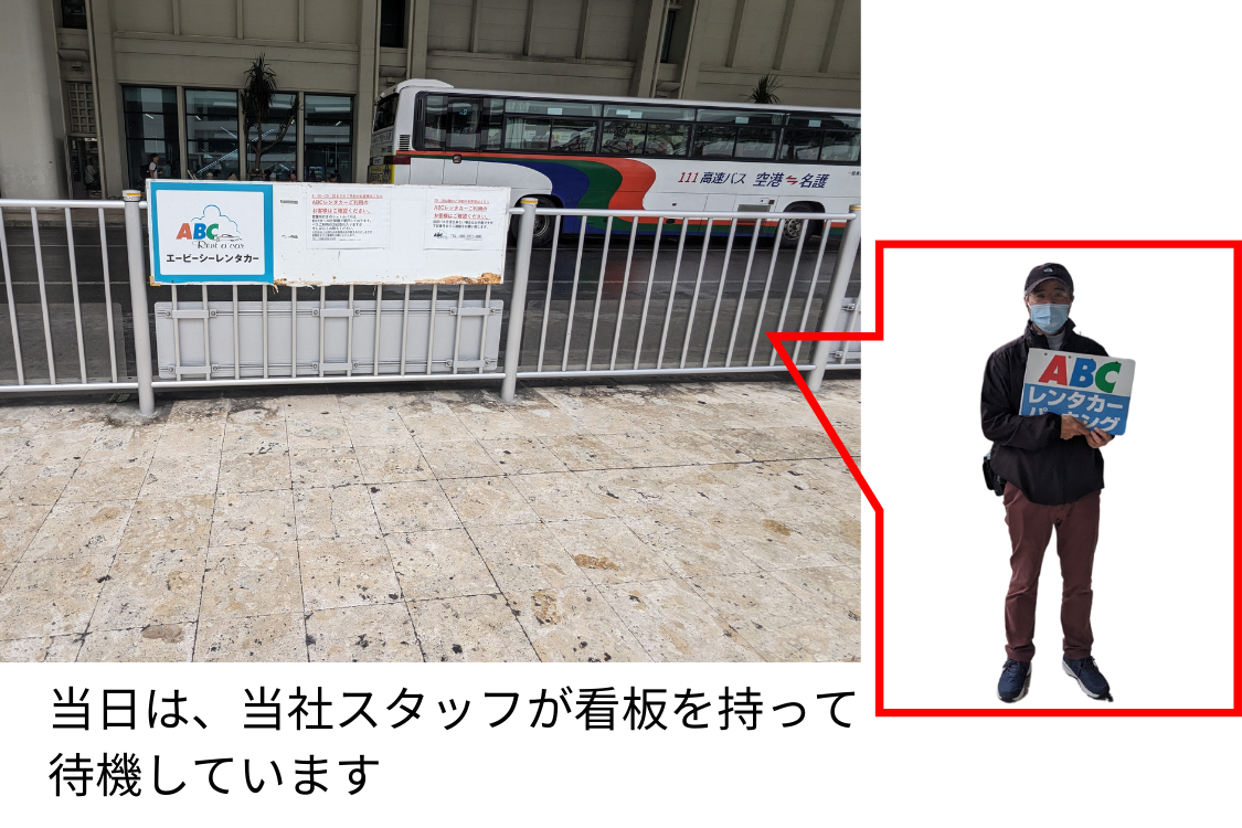 移動後、ABCレンタカーの旗が立てられているので、こちらでお待ちいただきますようお願いいたします。